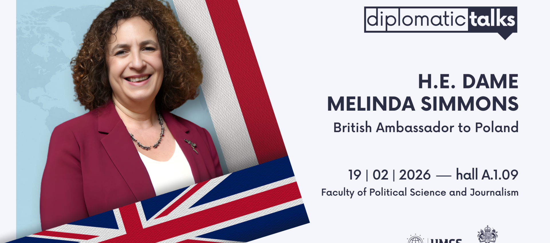 Melinda Simmons – Ambasador Zjednoczonego Królestwa Wielkiej Brytanii i Irlandii Północnej w Polsce będzie gościem kolejnego spotkania z cyklu Rozmowy dyplomatyczne (Diplomatic Talks). Wydarzenie odbędzie się 19 lutego (czwartek) o godz. 11.00 w auli A.1.09 Wydziału Politologii i Dziennikarstwa UMCS przy ul. Głębokiej 45 w Lublinie.