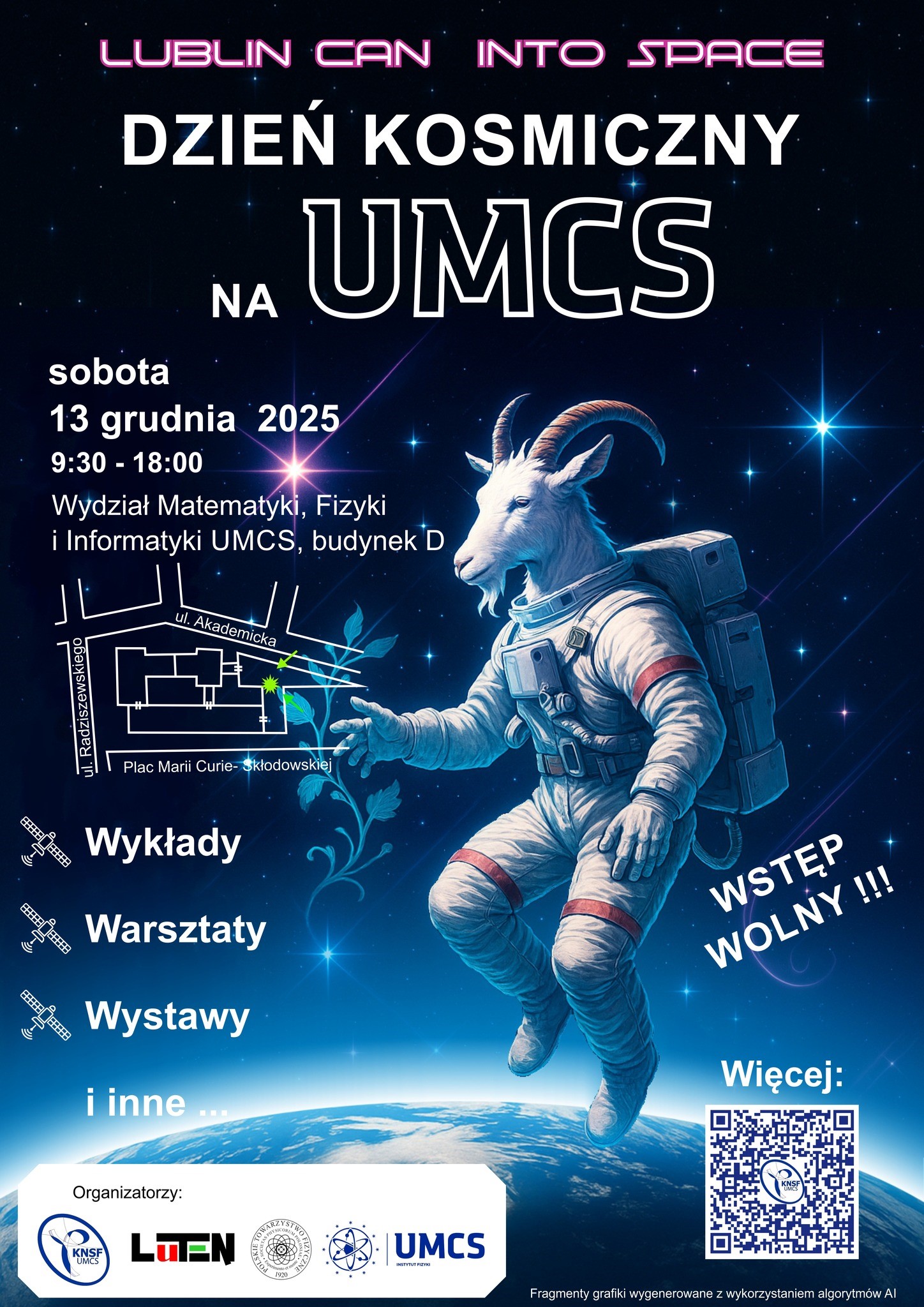 Wyobraź sobie sobotni poranek, w którym zamiast przeglądać seriale, pakujesz plecak i ruszasz do miejsca, gdzie Słońce, Mars i balon sub-stratosferyczny stają się codziennością. 13 grudnia Wydział Matematyki, Fizyki i Informatyki UMCS zmieni się w przestrzeń pełną astronomii, fizyki, technologii i rozmów z osobami, które na co dzień zajmują się zdobywaniem kosmosu. Od 9:30 do 18:00 budynek D będzie żył wykładami, warsztatami, pokazami i spotkaniami, które wciągną zarówno najmłodszych odkrywców, jak i studentów głodnych nowych inspiracji.