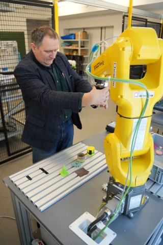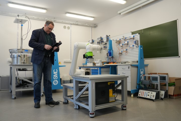 W Laboratorium Automatyki, Robotyki, Napędów Pneumatycznych, Hydraulicznych i Technologii Informatycznych stoją trzy roboty produkcyjne oraz cobot, czyli robot współpracujący z człowiekiem. To maszyny wykorzystywane w realnych zakładach przemysłowych.