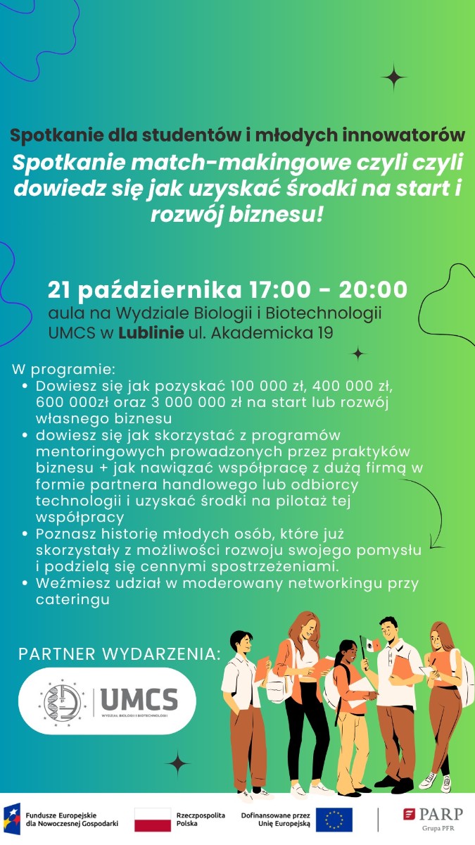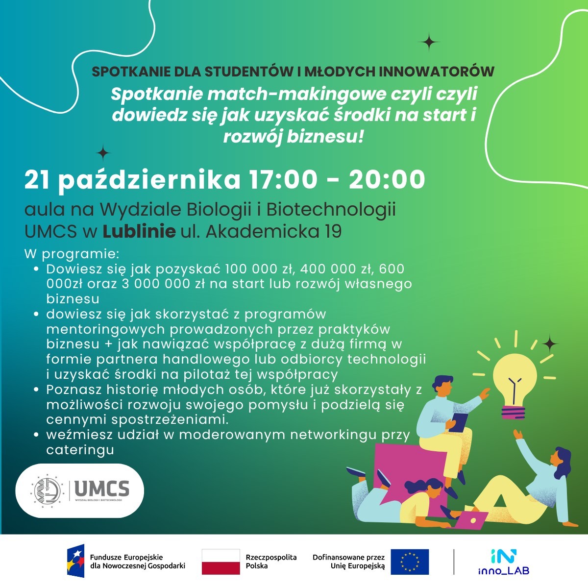 Masz pomysł, który aż się prosi, żeby wprowadzić go w życie? A może dopiero szukasz inspiracji? Spotkanie matchmakingowe na UMCS pomoże Ci zamienić ideę w działanie. To wydarzenie dla wszystkich, którzy chcą rozwijać swoje projekty – od pomysłów biznesowych po inicjatywy społeczne i badawcze.