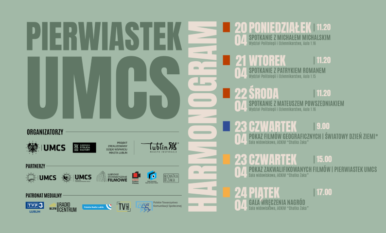 Wydarzenie rozpocznie się 20 kwietnia o godz. 11.20 w auli 1.16 na Wydziale Politologii i Dziennikarstwa UMCS. Inauguracyjne spotkanie poprowadzi Michał Michalski – reżyser, scenarzysta i montażysta.