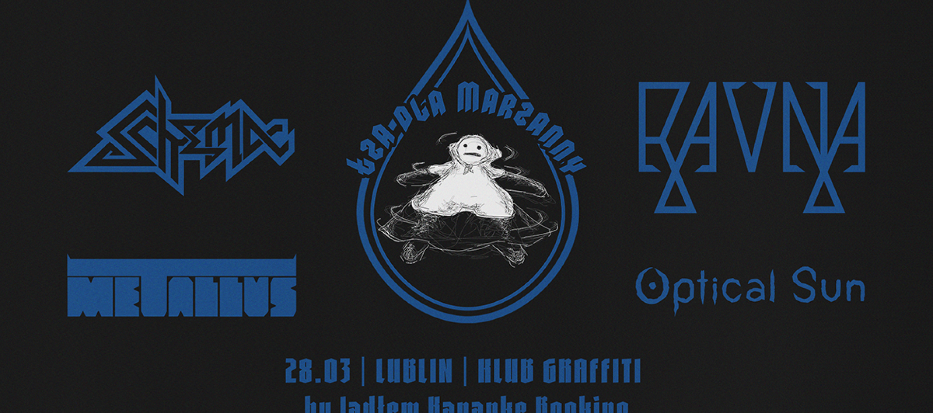 Na scenie wystąpią cztery formacje związane z doom metalem i jego odmianami. Warszawski SCHEMA odwołuje się do motywu przemijania i cytatu z Pierwszego Listu do Koryntian, budując ciężką, refleksyjną narrację dźwiękiem. RAVNA z Trójmiasta łączy doom i sludge metal z wątkami okultyzmu oraz psychodelii. Kolejny warszawski projekt, METALLUS, sięga po monumentalne, surowe brzmienia inspirowane mitologiczną estetyką. Skład uzupełnia lubelski OPTICAL SUN, który konsekwentnie buduje klimat bez światła i bez kompromisów.