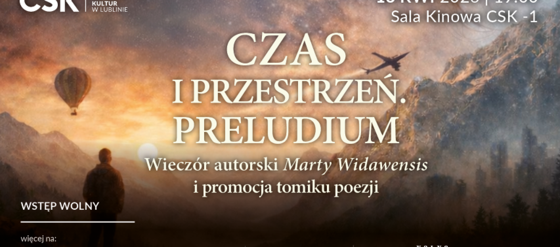 Spokojny wieczór z poezją i rozmową o tym, co trudno zatrzymać – 16 kwietnia Sala Kinowa Centrum Spotkania Kultur w Lublinie stanie się miejscem spotkania z Martą Widawensis. Autorka zaprezentuje swój tomik „Czas i przestrzeń. Preludium” i opowie o doświadczeniach, które stoją za powstaniem tych wierszy. Początek o godz. 19:00. Wstęp wolny.